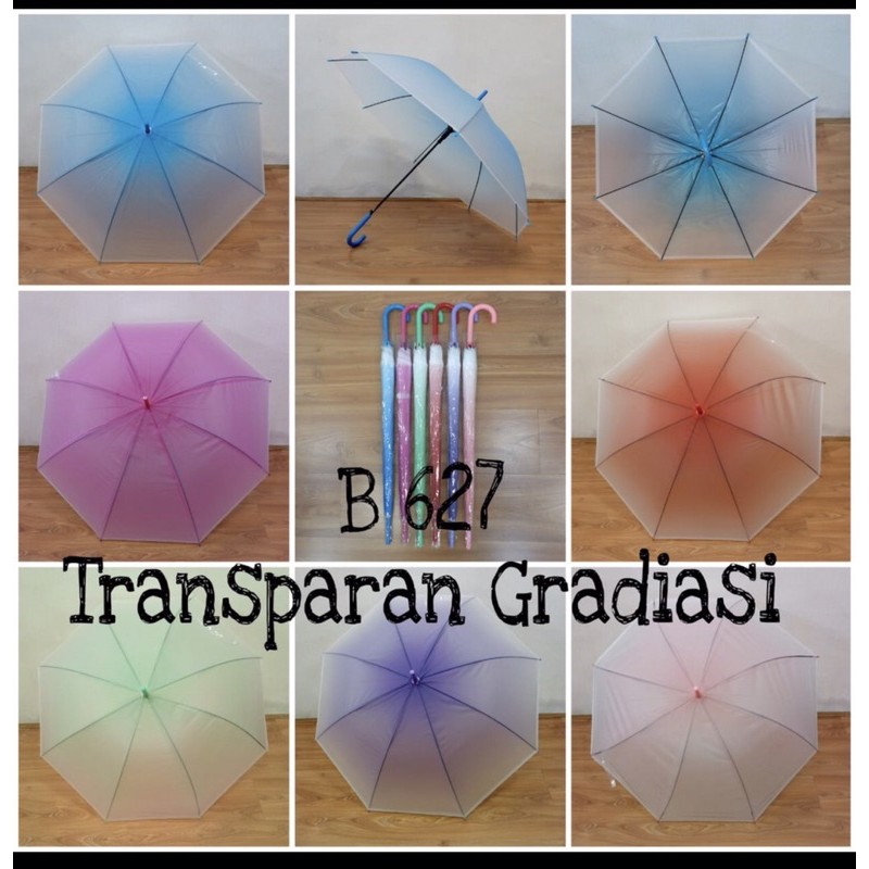 payung transparan gradasi bahan nylon diameter 39”panjang 75cm jari2: 8pegangan dari plastik payung tidak rembes. NOTE tolong chat tanya stok dulu. harap cantumkan juga warna cadangan di chat
