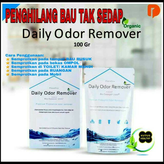Daily Odor Remover merupakan bahan penghilang bau tak sedap dengan bahan dasar mikroba probiotik yang ramah lingkungan.Daily Odor Remover ini memiliki banyak manfaat yang bisa mengatasi masalah sehari-hari, di antaranya :· Menghilangkan bau sampah· Menghilangkan bau hewan peliharaan· Menghilangkan bau kotoran· Menghilangkan bau urine· Menghilangkan bau organik lainnya· Pemeliharaan lingkungan· Aplikasi air limbah, peternakan, perikanan, dan agrikulturSolusi ramah lingkungan untuk mengatasi masalah bau tak sedap yang mengganggu kenyamanan setiap hari.Keunggulan produk :- Tidak berbahaya atau beracun merujuk pada OSHA 29 CFR 1910.1200- Ramah lingkungan- Tanpa bahan kimia- Tidak menimbulkan alergi- Aman untuk anak-anak dan hewan peliharaan- Tidak menimbulkan efek negatif pada lingkungan- Produk berbentuk padatan yang mudah disimpan dan digunakan- Kualitasnya sangat terjaga- Dilengkapi pathogen larva lalat untuk menekan populasi lalat- Sudah bersertifikasi sehingga aman dalam pemakaian jangka panjang.Sertifikat Pengujian : Microbiology Lab—Sucofindo, Certificate No.10446/DBBPAMSertifikat Organik : LeSOS No.240—LSO—005—IDN– 04–18" Cara pemakaian Daily Odor Remover 1. Ambil 5 gram Daily Odor Remover, larutkan dalam 100 ml. Takaran ini dapat digunakan untuk penggunaan rutin atau tahap pemeliharaan. Takaran pun dapat disesuaikan sesuai kebutuhan Anda.Untuk sumber bau yang sangat kuat, disarankan menggunakan campuran 10 gram (2 sendok) + 200 ml2. Diamkan campuran tersebut selama 10 – 15 menit atau sampai padatan mengendap, lalu masukkan ke dalam botol semprot.3. Semprotkan larutan ke sumber bau secara merata, lalu diamkan selama 1 sampai 2 jam dan buktikan sendiri keampuhannya.4. Simpan padatan di tempat yang terhindar dari paparan sinar matahari langsung. Produk yang sudah dilarutkan disarankan harus dipergunakan tidak lebih dari 2x24 jam untuk hasil yang opt