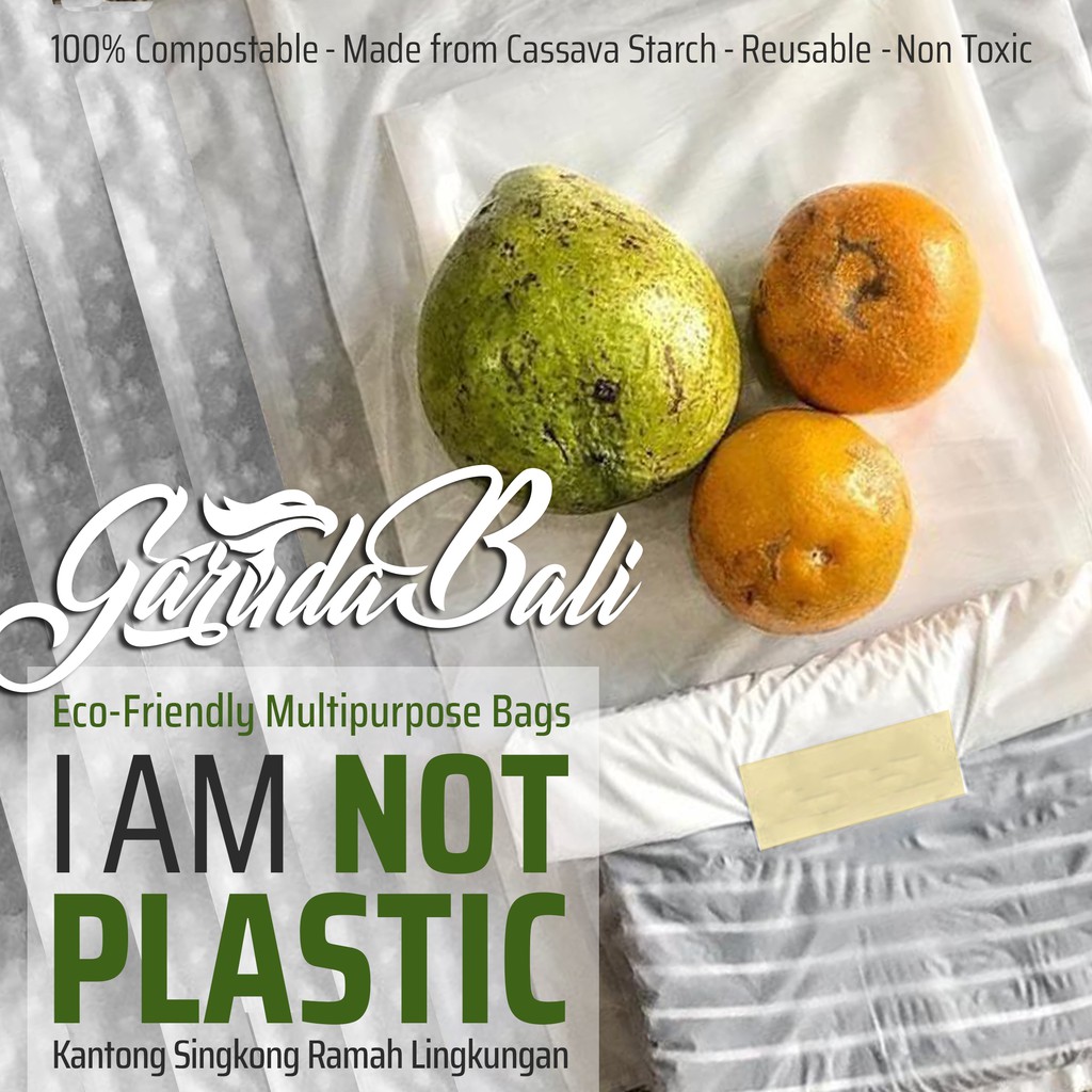 Harga Tercantum adalah Harga Satuan (1 Piece)Pembelian harus kelipatan 5 pcs setiap jenis varianVarian Produk dan Ukuran (Detail dapat dilihat Pada Gambar)MULTI purpose REGULAR : 21x32cm. Ketebalan : 40 Mikron. Warna WHITEMULTI purpose LARGE : 35x455cm. Ketebalan : 40 Mikron. Warna WHITE---------------------------------------------------Kantong SINGKONG Ramah Lingkungan - COMPOSTABLE MULTI-PURPOSE BAGI am NOT PLASTIC. Tidak Mengandung Bahan Plastik & Mikro PlastikKantong Nabati yang terbuat dari Pati Singkong, berfungsi sebagai pengganti kantong plastik.Walaupun sekilas penampilannya menyerupai kantong plastik konvensional,akan tetapi Kantong Singkong ini 100% TIDAK MENGANDUNG PLASTIK++ Direkomendasikan untuk Kantong Belanja Buah, Sayur di Pasar / Supermarket++ Ideal untuk Kemasan Packing Aman dan Kuat. Tidak Mudah Sobek++ SEALABLE with regular Impulse Sealer++ Merupakan solusi utk menggantikan kantong plastik konvensional demi kelestarian bumi.++ Kuat dan Dapat digunakan berulang kali.++ Pada akhir masa penggunaannya, Kantong Singkong yg dibuang ke tempat sampah akan menjadi kompos.++ Smooth Surface, Tekstur Permukaan Sangat Lembut di Tangan++ ZERO WASTE, Terurai sempurna oleh microorganisme dan makroorganisme dalam tanah++ Terurai menjadi co2 dan h2O ++ Larut dengan cepat dalam air panas++ Tidak berbahaya apabila tidak sengaja termakan oleh hewan++ Menjaga kemampuan tanah menahan air++ Dapat didaur ulang bersama sampah kertas++ HEALTHY LIFE, Bebas Bahan Kimia Berbahaya (Penyebab Kanker) yang terkandung dalam material PlastikEveryone can be Earth Warrior. Ayo Gunakan Kantong Singkong dalam Keseharian Anda.Sangat Cocok juga digunakan pada industri Fashion, Butik, hotel, villa. souvenir, Resto, Cafe, wedding etc.Bahan Baku : Pati Singkong (Cassava Starch), Turunan Minyak Nabati, Waterbased Soy Ink, 0% Kandungan Unsur Pl